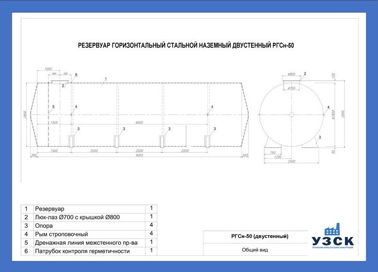 РГСДн-50: горизонтальный резервуар двустенный наземного расположения;